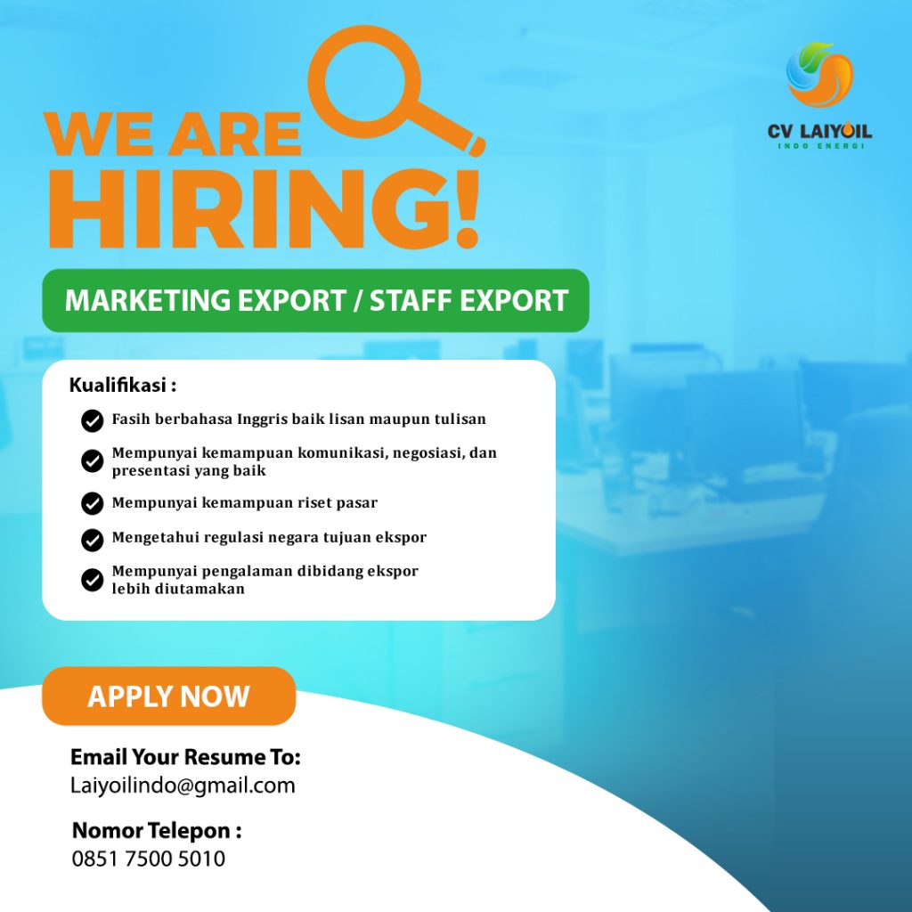 CV Laiyoil Indo Energi membuka lowongan pekerjaan untuk posisi Marketing Export / Staff Export. Bergabunglah bersama tim kami dan kembangkan potensi terbaik Anda di lingkungan kerja yang profesional.